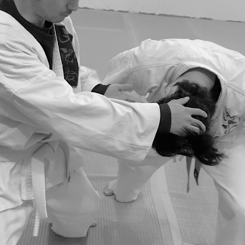距離を取って突き合うのではなく、相手を掴み、体勢を制しながら身を守る。剛柔流特有の接近戦の考え方です。
